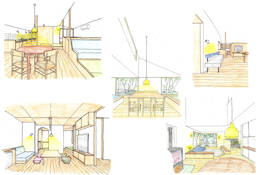 スケッチは家具と空間の使い方を設計に落ち仕込むために、実際のプレゼンでお見せしてきたものたちです。